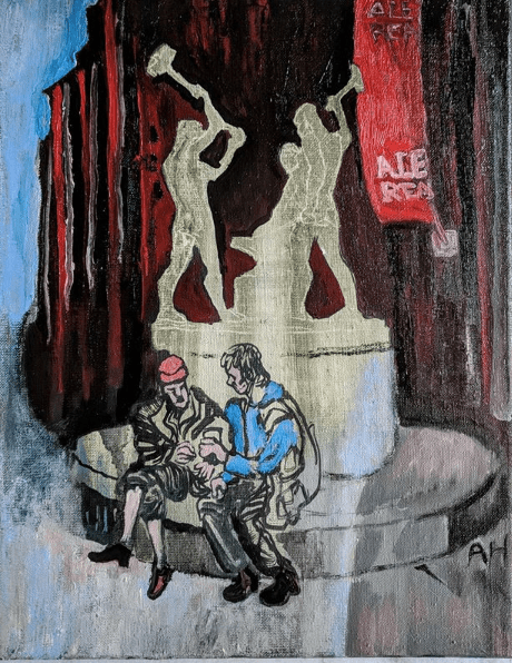 Joulukuussa 2016 ostin Rotterdamin reissulla pienen maalaustelineen. Olin maalannut tosissani viimeksi vuonna 1994. Ajattelin harrastaa taidemaalausta huvin vuoksi. Se oli kohtalokasta. Nyt sudin kaksi-kolme maalausta joka viikko, enkä aio lopettaa. Ehkä eniten minua viehättää mahdollisuus kuvittaa maalauksiini katkelmia todellisuudesta. Kuvien sijasta voisin kirjoittaa blogia, esseitä tai tehdä esityksiä. Arvelen, että minulle on luontevampaa maalata. En todellakaan ole taidemaalari. Minulle taiteessa sanoma menee aina teknisen osaamisen ylitse. Pohdin paljon sitä, mitä kuvieni ihmishahmot tekevät, mitä he ajattelevat ja millainen ympäristö on. Toisinaan maalauksen rakentaminen tuntuu nukkekotileikiltä. Viime aikoina olenkin useammin nykyteatteria tai esitystaidetta katsomassa kuin kuvataidenäyttelyissä. Silti maalausten nimeäminen on hankalaa, koska kuva on jaettava muiden kokijoiden kanssa. Ja metodini on työstää kuvasarjoja, jotka liittyvät samaan teemaan. Mielenkiintoinen teema on moniääninen, sillä on monta sanoittajaa.