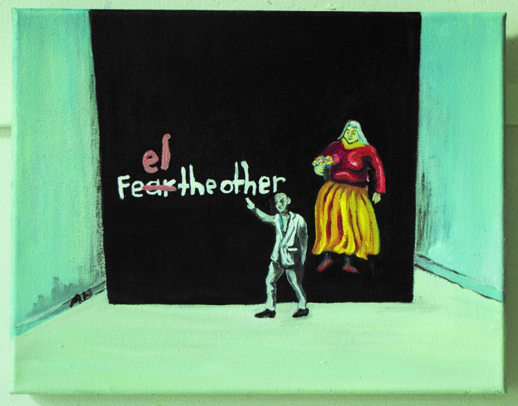 Luin Voltairen romaanin Candide loppuvuodesta 2016. Se on osasyy maalausprojektiini. Hämmennyin, koska romaani resonoi suoraan tämän ajan inhimillisten, poliittisten, uskonnollisten kysymysten kanssa. Candide on sivustakatsoja, ja siltä minustakin eurooppalaisena kansalaisena tuntuu. Olen tänä vuonna työstänyt kaksi näyttelyä nimeltä Optimisti Rovaniemelle ja Turkuun. Seuraava tulee Helsinkiin Galleria Huutoon lokakuussa 2018. Kuvissa seikkailee tämän ajan optimisteja ja pessimistejä, aiheet tulevat päivittäisestä uutisvirrasta ja suodattuvat henkilökohtaisen suodattimeni lävitse.