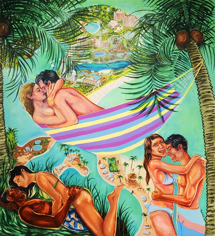 Esteettisesti viehätyn karnevalistisesta väri-ilottelusta ja tunnelmasta, joka on vähän vinksallaan. Olen kuvaillut maalausteni maailmaa kuin koukuttavaksi tietokonepeliksi, jossa on ikuinen kesä eikä ikinä tylsää. Se houkuttelee katoamaan lapsenomaiseen fantasiaan, joka viettelee mukaansa yhä syvemmälle taianomaisena hehkuvaan maisemaan. Tarinan henkilöt ovat välitilassa, kieppuen karusellissa tai sairaina sokerihumalasta. Ytimessä on nautinto. Usein katsojat löytävät teoksista tummempia sävyjä kuin mitä itse olin tullut ajatelleeksikaan. Omasta mielestäni teoksissani on mukana myös paljon (toisinaan toki synkkää) huumoria.